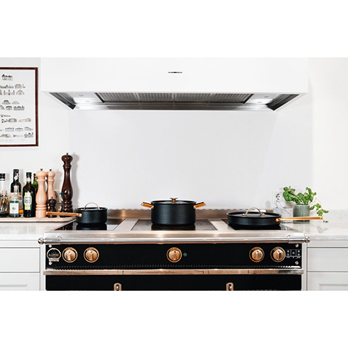 Unikt set i mattsvart hamrad yta med detaljer i mässing. Diskmaskinsäkra och fungerar lika bra på induktion som glas-keramik-, emalj- samt gashäll. Lock i rostfritt stål ingår. Kan köpas separat eller som ett komplett set.