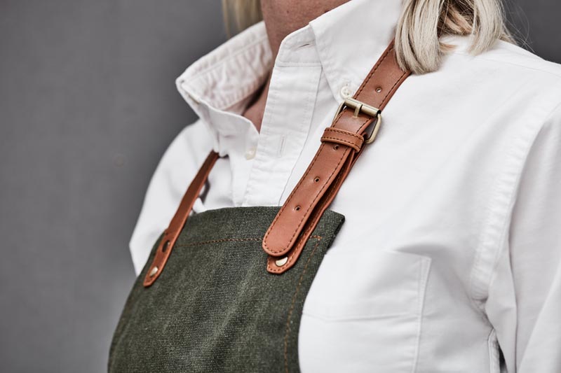 Robust grönt förkläde i stentvättad canvas 280 gsm med konstläder detaljer. Ett förkläde med lång livslängd som bara blir finare med tiden.