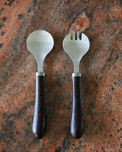 Salladsbestick i vår favoritkombination av rostfritt stål och vackert böjt handtag i chokladbrunt wengeträ. Kombinationen blir spännande, en klassiker men med en tuffare touch. Kommer i ett kit av 2.