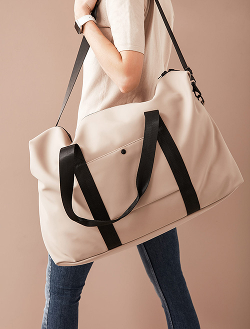Med denna rymliga weekendväska över axeln går du inte obemärkt förbi då den ger uttryck för stil och minimalism på samma gång. Väskan har en justerbar axelrem. För att ge bättre organisationsmöjligheter har väskan utrustats med en ficka med blixtlås på ena sidan och en liten ficka med tryckknapp på den andra. Tillverkad i nubuck-PU vilket ger dig en väska med vattenavvisande egenskaper.