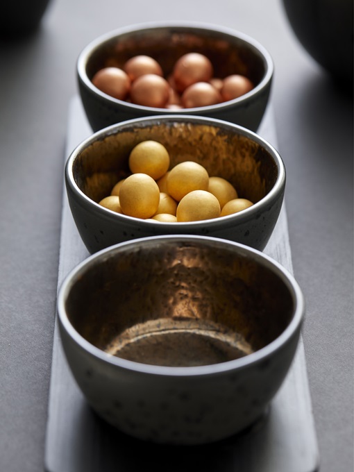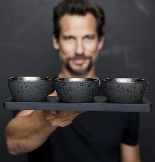 BITZ Cabaretset innehåller en svartbetsad träbricka och tre skålar i stengods. Kombinationen av skålarnas utvändiga matta glasyr och bronsmetallic glasyr på insidan ger ett unikt uttryck, och det finns inte två skålar som är helt lika.