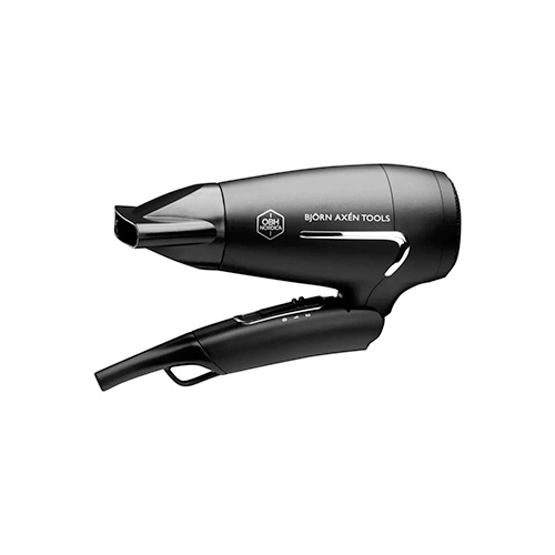 - Kompakt, hopfällbar resehårtork med omkopplingsbar spänning