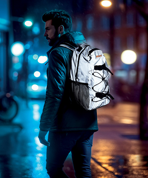 Ryggsäck i högreflekterande 190T polyester med snöre på framsidan. Vadderad rygg, remmar och botten. Den har ett fack för 15'' bärbar dator. En nätficka på ena sidan och en ficka med dragkedja på den andra sidan.
