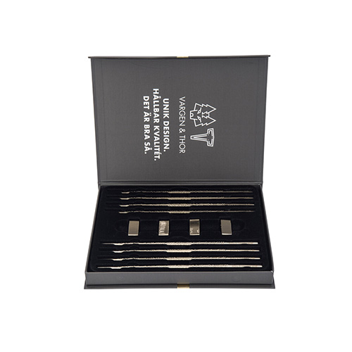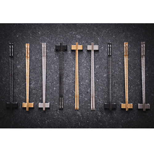 Chopsticks i rent, tåligt och hållbart stål med hamrad yta. Varje set levereras med 4 par pinnar (totalt 8 st pinnar) samt 4 st chopsticks-ställ i matchande färg. 100% diskmaskinssäkra. 5 års garanti. Finns i 5 färger.