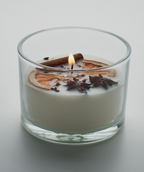 Doftat växtbaserat vaxljus med torkade blommor och frukter i glasburkshållare. Doft kanel <(>&<)> Citrus 300 gr. Brinntid: 50 timmar.