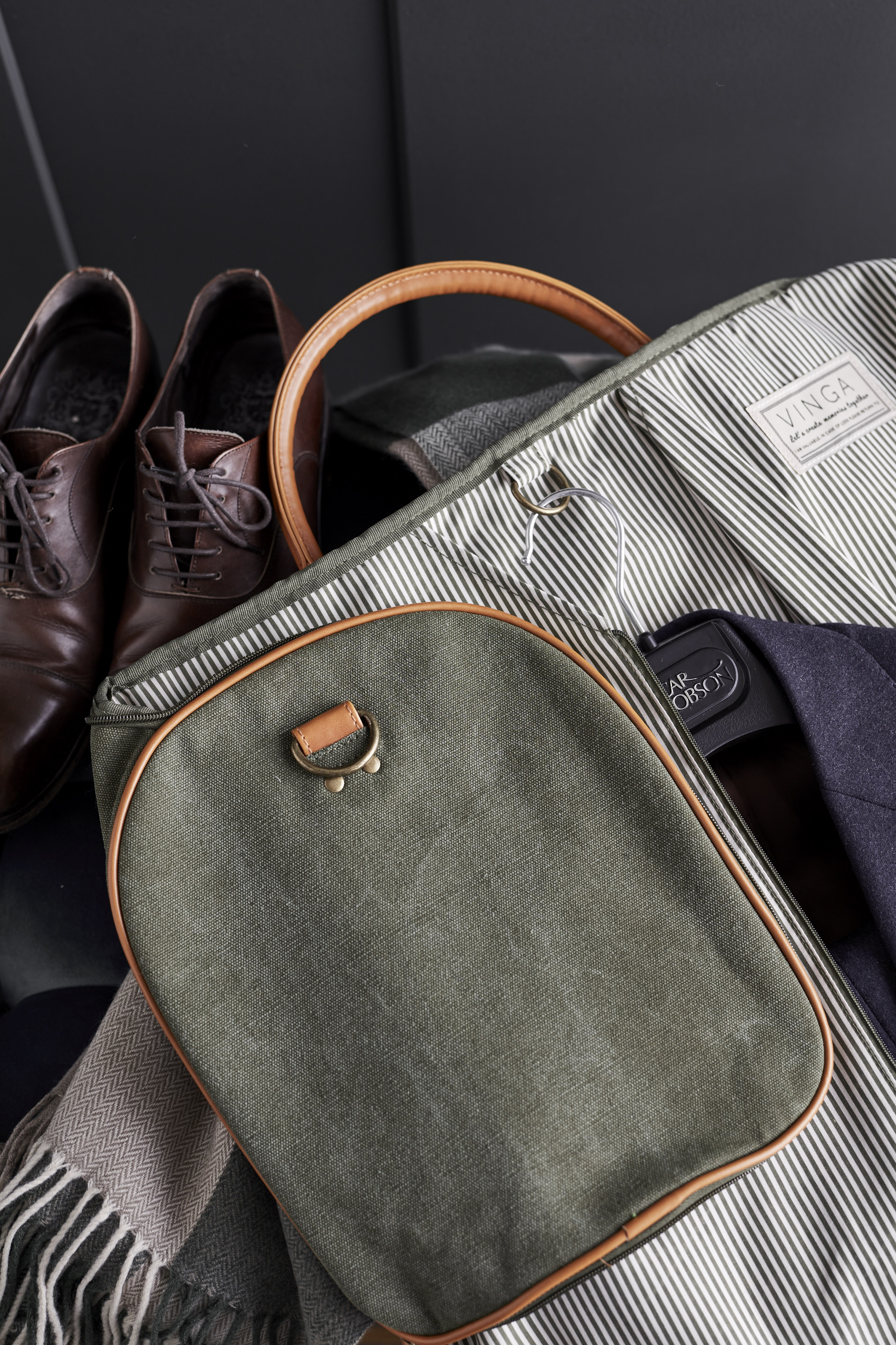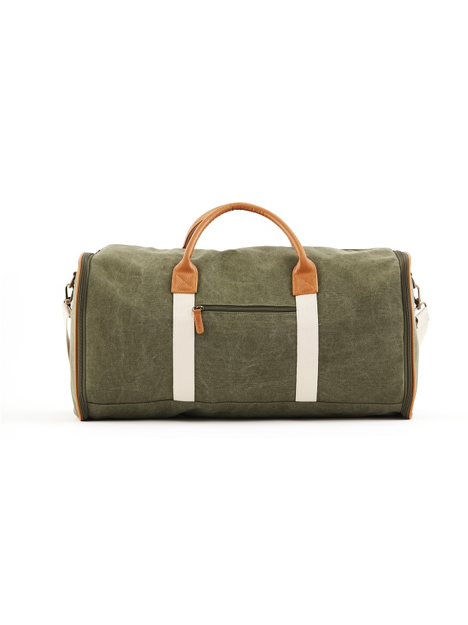 Weekendbag med inbyggt kostymfodral där man kan förvara sin kostym och sina skjortor. När man drar ihop fodralet får den funktionen av en väska. I stentvättad bomullscanvas med detaljer i konstläder, blir väskan en tidlös följeslagare, som bara blir vackrare med åren. Med fina detaljer från dragkedja till foder, kombineras här funktion med design på bästa sätt. Väskan har en mindre ficka på långsidan.