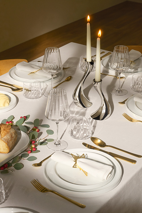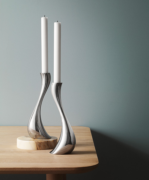 Den här ljusstaken har ett klassisk men dramatisk svängd form. Det sätt den reser sig på ser nästan ut att trotsa tyngdlagen. Den delar många kvaliteter med ormen som gett den sitt namn: den är imponerande, modig och effektfull. Formen inspirerades delvis av smältande vax. Kurvan är så dynamisk att den liknar en klassisk ljusstake som har börjat smälta. Det är något förföriskt med formen, med den dynamiska spiralformen och spegelblanka ytan i rostfritt stål. Den blanka ytan fångar och reflekterar ljuset. Om du köper två eller fler öppnar du dörren till oändliga dekorationsmöjligheter.