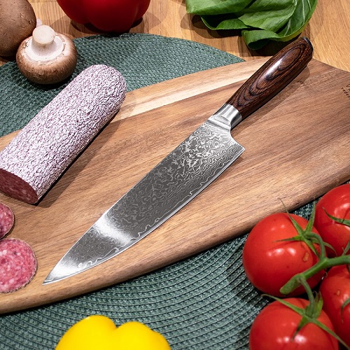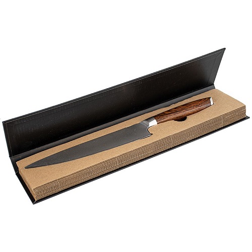 Vacker kockkniv i 67-lagers damascusstål 10Cr15MoV och med ett greppvänligt handtag i underhållsfri Pakka Wood. Levereras i en elegant och miljövänlig svart förpackning. Mått:20cm