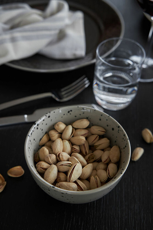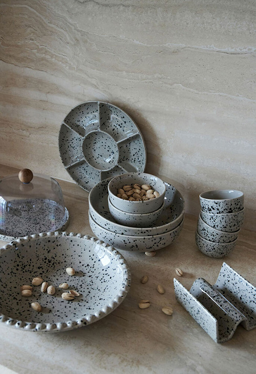 En mellan skål för snacks eller frukostflingor. Kulören går i en beige/grå ton med ett fint stänkmönster i svart. Denna skål har bara mönster på utsidan för att skapa harmoni och karaktär mellan seriens olika delar. Tillverkad i stengods. Är även fin att kombinera med Coffee & More serien. Säljs i 2-pack. Ditte är handgjord. Färg och yta kan därför variera från en produkt till en annan. Varje produkt är unik i sitt slag.