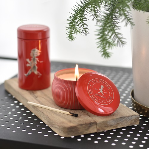 Ett paket innehållandes ett elegant doftljus samt ett stilrent tändsticksrör i plåt.