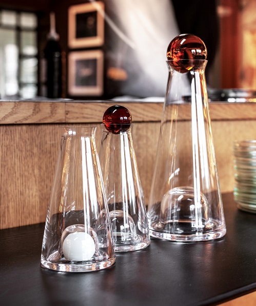 Lillasyster till Design House Stockholms munblåsta karaff Fia. Den mindre varianten kan användas till olja, eller som en personlig liten vin- eller vattenkaraff. Fia går även att använda som vas till de små buketterna. Den medföljande kristallkulan kan användas som en propp eller förvaras vid botten av karaffen som en iögonfallande dekoration. Karaffen kan diskas i diskmaskin.