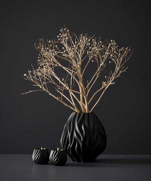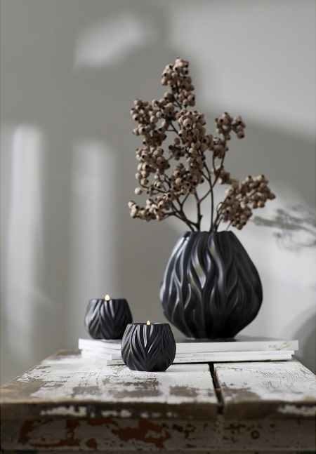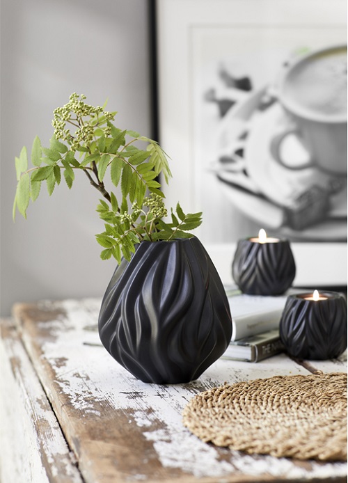 Flame vas, 19 cm hög, samt ett set med två Flame värmeljusstakar i samma skulpturala design som vasen. Alla delar är tillverkade i porslin med en vacker matt svart glasyr. Vasens och ljushållarnas organiska mönster leder tankarna till eld och flammor.