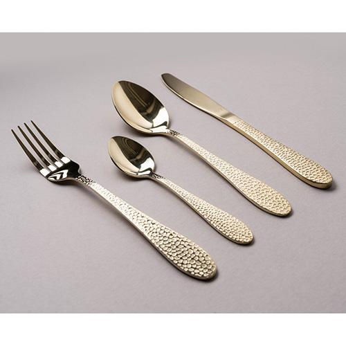 Unikt bestickset av hållbart rostfritt stål med hamrad yta i färgen Aura Cava. Diskmaskinssäkra.