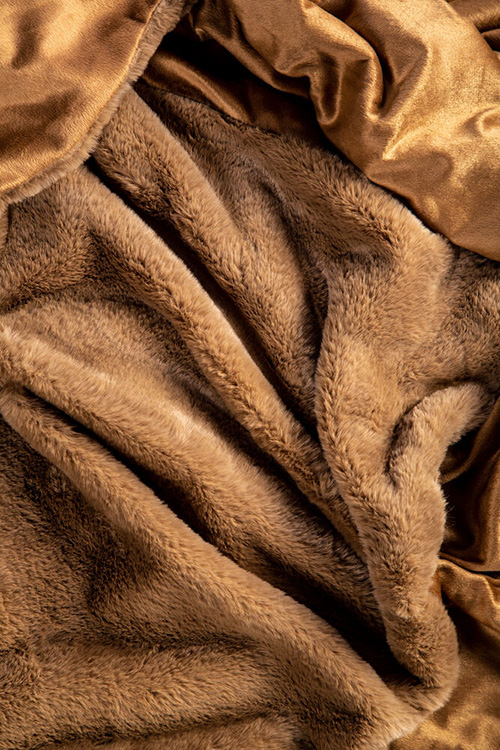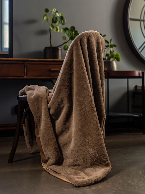 Underbart mjuk och varm pläd tillverkad i fuskpäls och mikromink som ger den ett pälsliknande utseende. Filten är stor och värmande och förhöjer myskänslan i hela rummet.