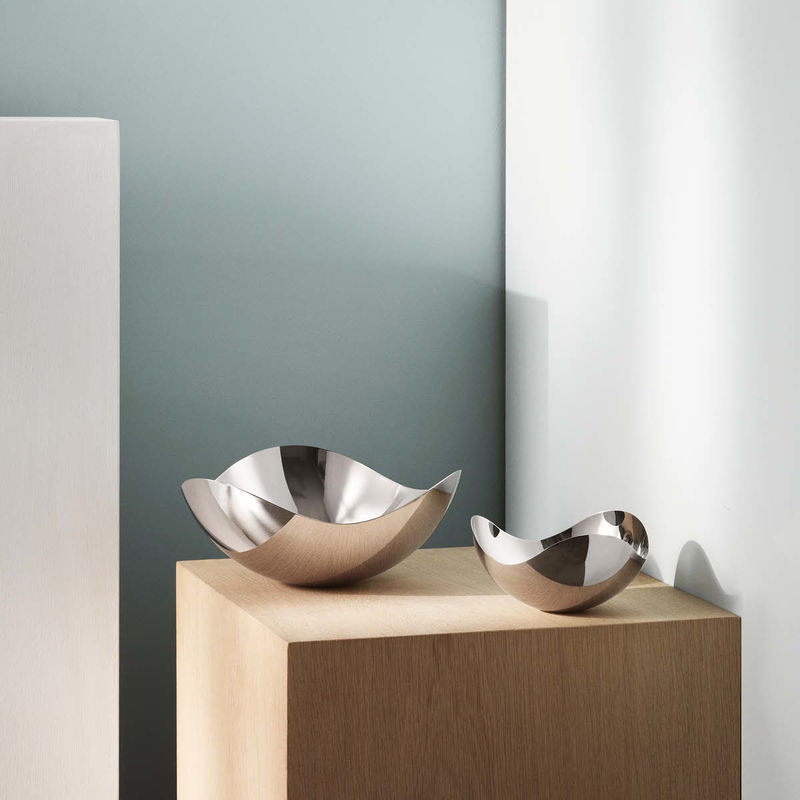 Helle Damkjær hämtade sin inspiration från körsbärsblommor i full blom när hon skapade den populära Bloom- serien. "Min studio ligger i Paris, en av Europas mest spännande storstäder. För att utmana och bryta mot de inspirationskällor jag hittar i Europa, brukar jag åka till Mellanöstern för att låta mig inspireras av Asiens unika landskap och naturliga former. Jag var i Japan på våren och blev vittne till den överväldigande skönheten hos körsbärsblommor som står i full blom. Körsbärsblommans mjuka konturer och former gav mig inspiration till att skapa Bloom", berättar Helle Damkjær. Bloom-skålarna är tillverkade i rostfritt stål och passar både för uppläggning av god mat såväl som bordsdekoration. Material: Blankpolerat rostfritt stål_x000D_ Mått: H: 140 mm. Ø: 340 mm._x000D_ Designår: 2012_x000D_ Produkten lämpar sig för livsmedel
