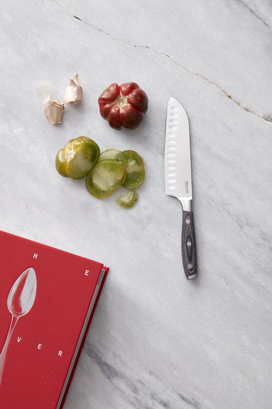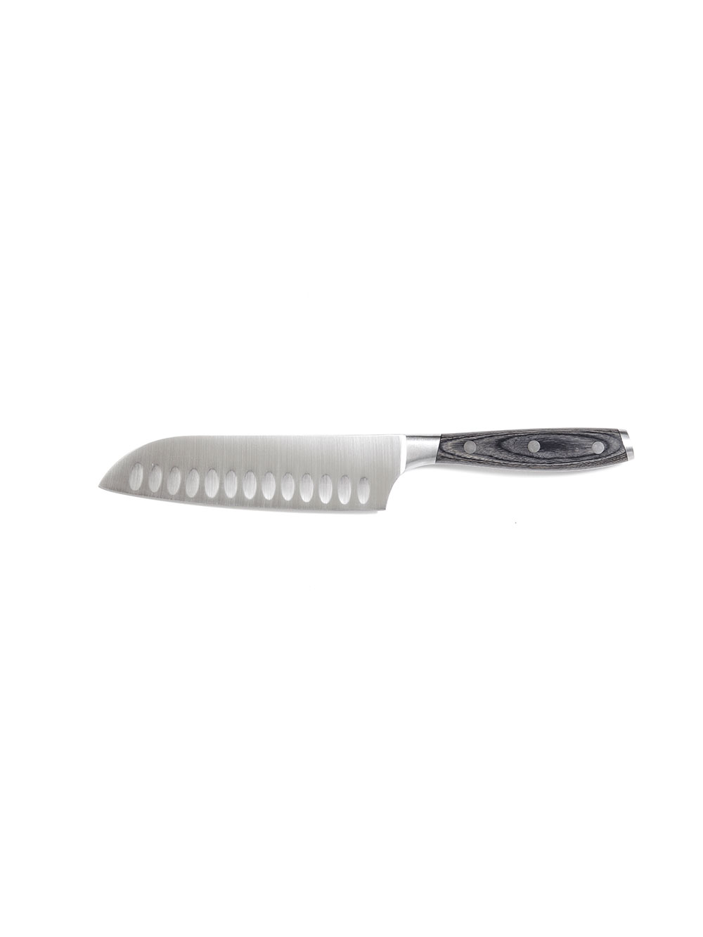 Santokukniv från Kaiserserien som innehåller knivar tillverkade av tyskt stål (X50CrMoV15), samt har ett handtag i pakkaträ. Handtaget är greppvänligt vilket tillsammans med dess välbalanserade kropp från ände till egg gör den skönare och lättare att arbeta med. Det tyska stålets goda egenskaper gör att knivarna blir fläckbeständig, samt håller skärpan länge.