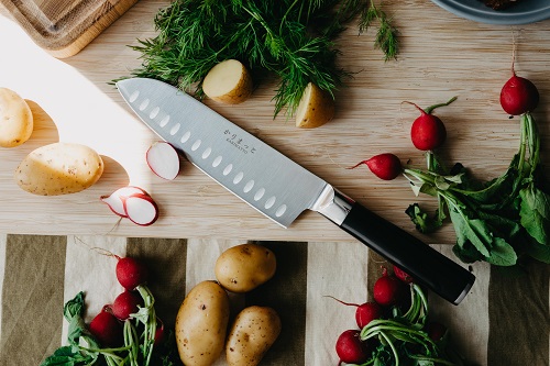 Santokukniv från Karimatto by Culimat som passar utmärkt som universalkniv för att skära kött och grönsaker.