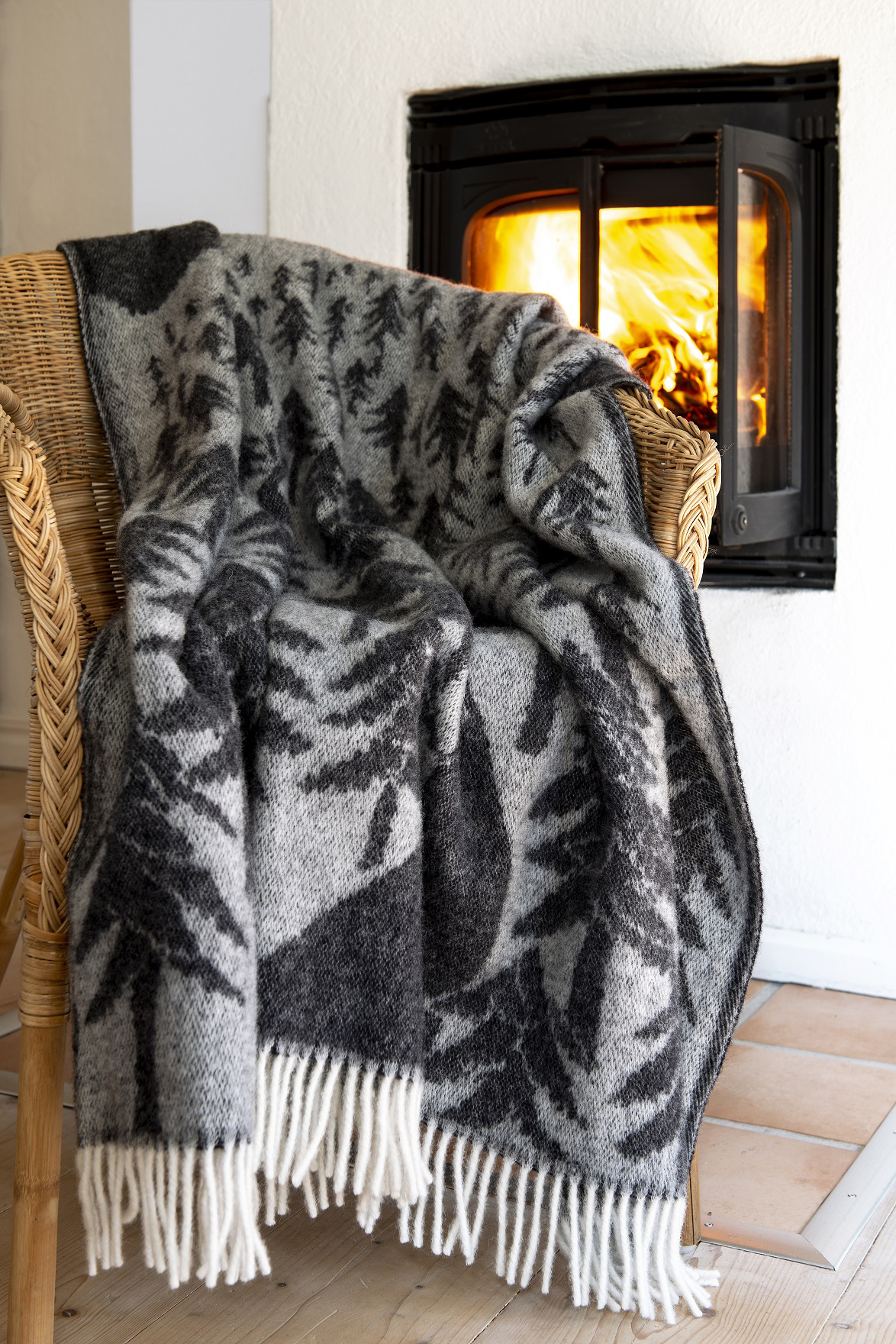 Denna vackra pläd är designad av den världsberömda japanska designern Akira Minagawa. Mönstret är ett riktigt konstverk som fångar känslan i den nordiska naturen med ett litet hus omgivet av granar. Ullfilten är inte bara en blickfångare utan även härligt varm att omfamna kyliga dagar.
