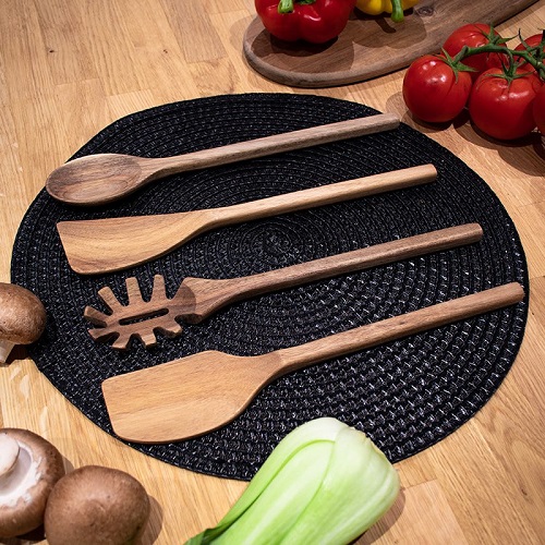 Set med fyra vackra och användarvänliga köksredskap (Slev, stekspade, spaghettislev samt slickepott). Tillverkade av FSC-certifierad Acacia. Mått: 30,5cm