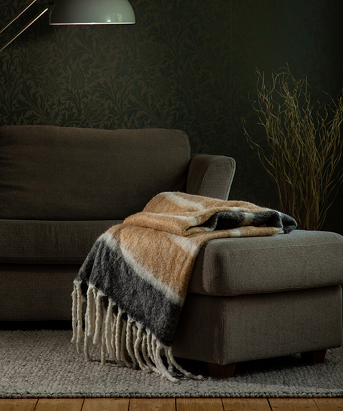 Denna randiga handvävda pläd är både mysig och stilren! Tillverkad av högkvalitativ ull och akryl, och med stora tjocka fransar för en extra touch av elegans. Perfekt för att krypa upp under en kall vinterkväll.