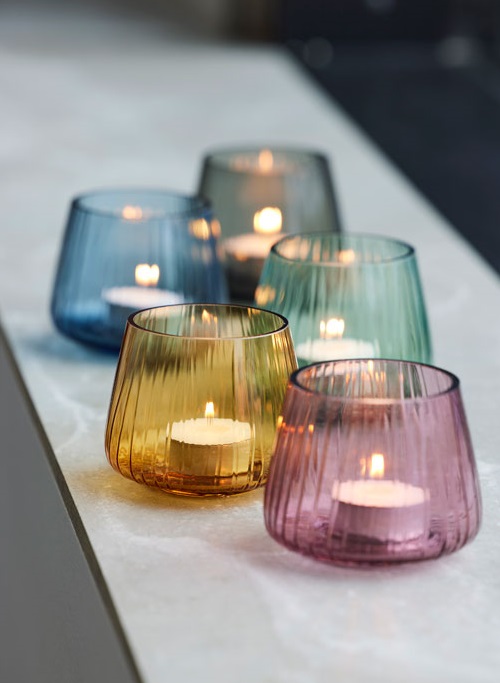 Värmeljushållarna finns i färgerna grönt, amber, rosa, blått och smoke.