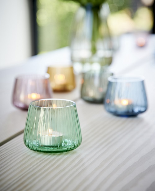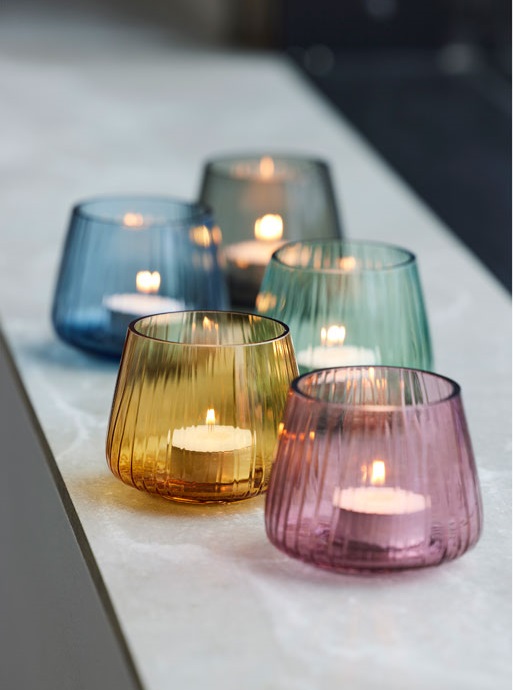 Värmeljushållarna finns i färgerna grönt, amber, rosa, blått och smoke.