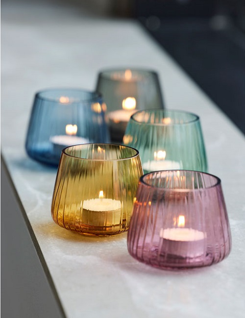 Öka mysfaktorn med de båda vackra värmeljushållarna i genomfärgat, räfflat glas.