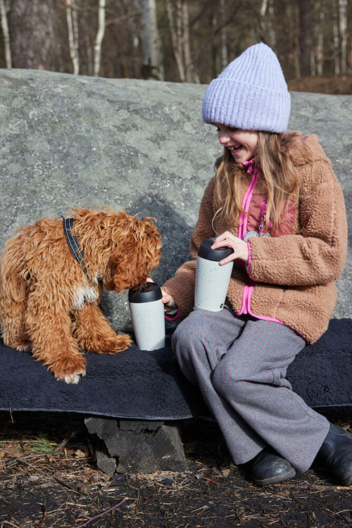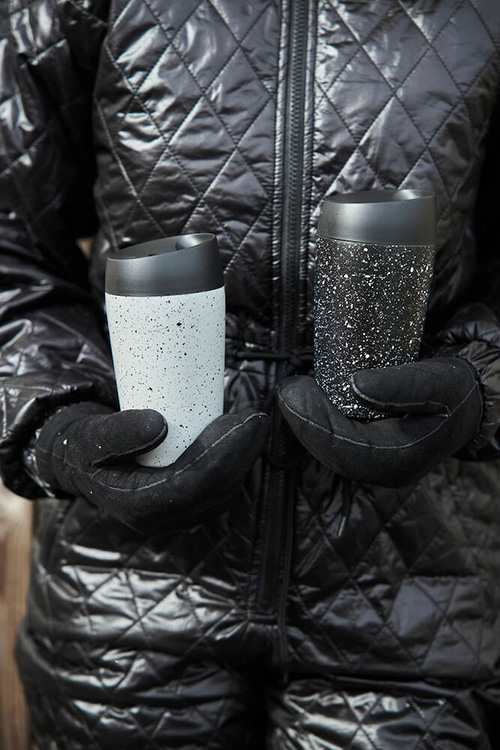Loke i vitt med ett svart stänkmönster, en resemugg som vi båda älskar för sin variation, färgval och konstruktion. Loke är en serie produkter vars syfte är att förenkla vardagen. Loke rymmer 24 cl och kan enkelt placeras under kaffemaskinen för påfyllning. Muggen har dubbla väggar för att hålla drycken varm längre. Men det bästa av allt är att det inte finns något läckage tack vare en smart låsfunktion.