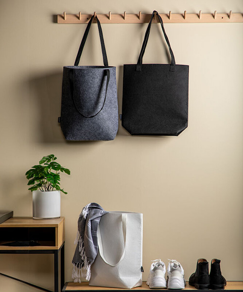 Enkel och praktisk filtväska som är gjord av återvunna PET-flaskor. Långa handtag för att kunna hänga väskan på axeln. Väskans botten kan både väcklas ut och vikas in, både för en stabil botten vid användning och för smidig förvaring.