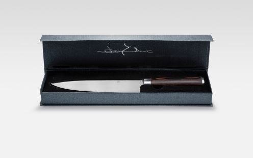 Klassisk kniv i stilren design, noga utvald för finsmakare av Markus Aujalay. Vass kniv som gör matlagningen roligare och enklare, med en perfekt kniv för varje tillfälle. Satinpolerade knivblad av högsta kvalitet. Svarta greppvänliga handtag och Markus Aujalays logo/tecken snyggt etsad/tryck på bladet.