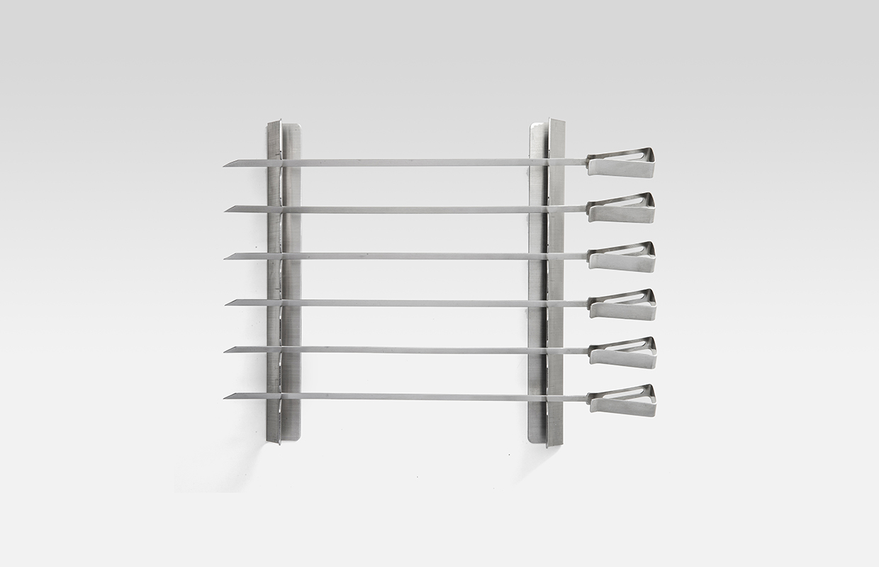 Ett revolutionerande set med 6 grillspett och en ställning att lägga spetten på, vilket gör det enkelt att vända spetten och inget fastnar i grillgallret. Nu kan du lätt grilla ditt kött, fisk och även grönsaker som tomater utan att dom ”rullar” runt eller trillar ner i grillen. Exklusiva och gedigna grillspett noga utvalda av Leif Mannerström gör grillningen till en ren njutning. Tillverkade av högsta kvalitet i 18/10 rostfritt stål. Spettens längd är 36 cm. Setet ligger packat i en färgkartong.