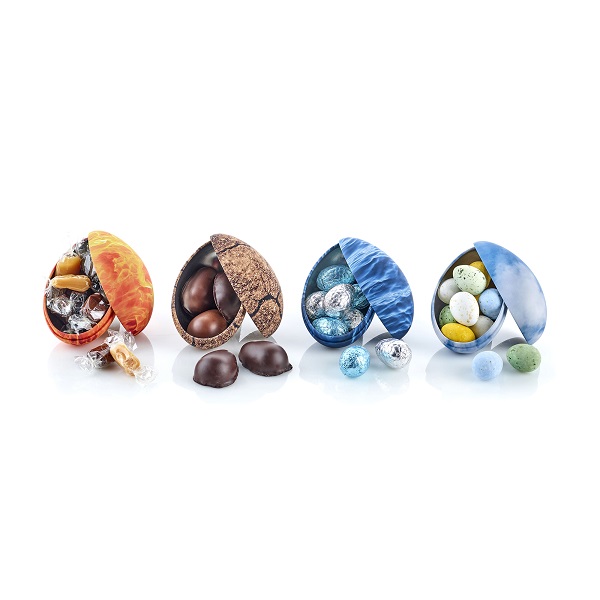 4 st metallägg med mönster av de 4 elementen. Innehållande: Chokladägg, marsipanägg, lyxchokladägg i folie och karameller. 285g