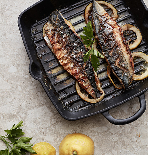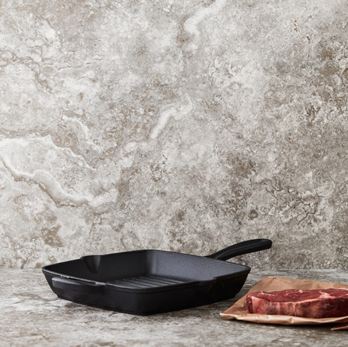 Klassisk grillpanna i emaljerat gjutjärn i Monte-serien. Ränderna i pannan höjer upp råvarorna och skapar därmed den indirekta värmen som vi känner igen från grillen. De gör även att fetter rinner av och motverkar således att maten kokar i fett. Gjutjärnet gör att värmen fördelas jämnt över hela pannan och att den bibehåller värmen under lång tid. Materialet är väldigt tåligt och pannan går att använda på flera olika värmekällor, inklusive i ugn - perfekt om du behöver hålla middagen varm länge.