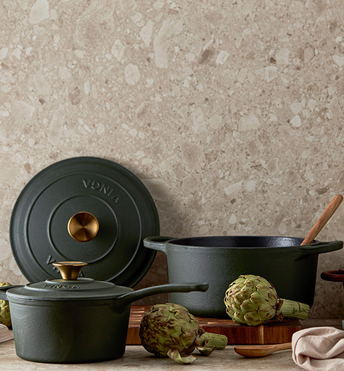 En klassisk gjutjärnsgryta i Monte-serien. Tack vare gjutjärnets goda värmeegenskaper är den idealisk till grytor och långkok. Utöver det har den en tjock botten, vilket gör att innehållet inte bränner fast lika lätt. Locket är försett med små piggar som gör att vattenångan som kondenseras fördelas jämnt och fint över innehållet – en självösningsfunktion. Insidan har en svart emaljering med större porer som har en något ruffare yta. Detta gör att porerna över tid fylls med olja och utvecklar en nonstick patina på samma sätt som rågjutjärn. Fungerar på alla typer av spishällar inklusive induktionshäll.