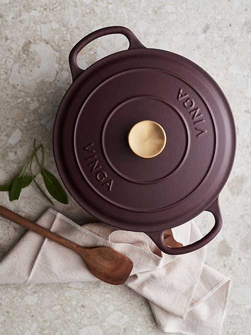 En generös och gedigen gjutjärnsgryta i Monte-serien. Tack vare gjutjärnets goda värmeegenskaper är den idealisk till grytor och långkok. Utöver det har den en tjock botten, vilket gör att innehållet inte bränner fast lika lätt. Locket är försett med små piggar som gör att vattenångan som kondenseras fördelas jämnt och fint över innehållet – en självösningsfunktion. Insidan har en svart emaljering med större porer som har en något ruffare yta. Detta gör att porerna över tid fylls med olja och utvecklar en nonstick patina på samma sätt som rågjutjärn. Fungerar på alla typer av spishällar inklusive induktionshäll.
