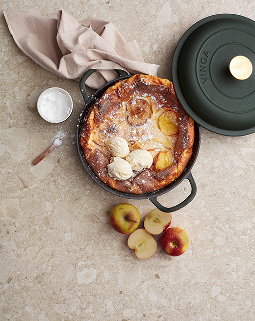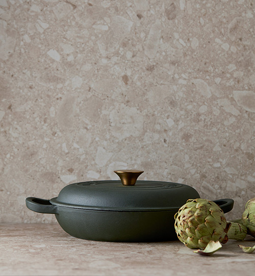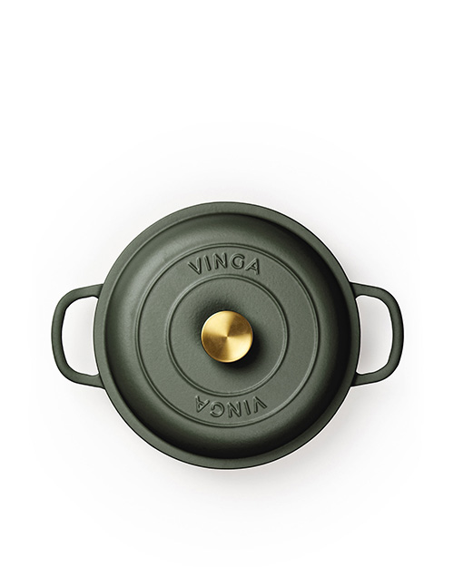 En gjutjärnstraktör i Monte-serien med flera användningsområden. Perfekt till stekning, mindre grytor eller såsigare rätter, passar även utmärkt att använda som ugnsform. Gjutjärn har goda värmeegenskaper och denna gryta har en tjock botten, vilket gör att innehållet inte bränner fast lika lätt. Locket är försett med små piggar som gör att vattenångan som kondenseras fördelas jämnt och fint över innehållet – en självösningsfunktion. Insidan har en svart emaljering med större porer som har en något ruffare yta. Detta gör att porerna över tid fylls med olja och utvecklar en nonstick patina på samma sätt som rågjutjärn. Fungerar på alla typer av spishällar inklusive induktionshäll.