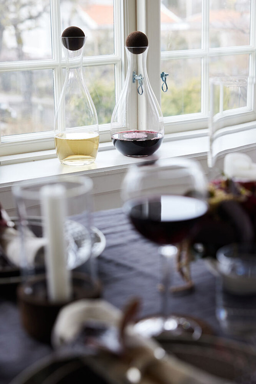 Nature vinkaraff med korklock förenar hållbarhet, böljande former och mystik. Den mörkbruna korkkulan ger karaktär och för tankarna till havets flaskposter som vandrat längs havets botten med små vackra meddelanden. I nutid signalerar den bruna färgen lyx och korken hållbarhet. Karaffens form är böljande och harmoniserar med glasserien Saga. Karaffen finns i två storlekar och former.