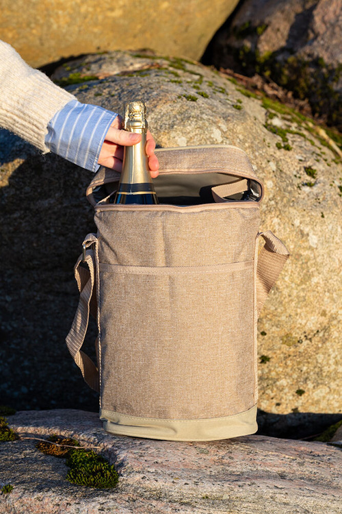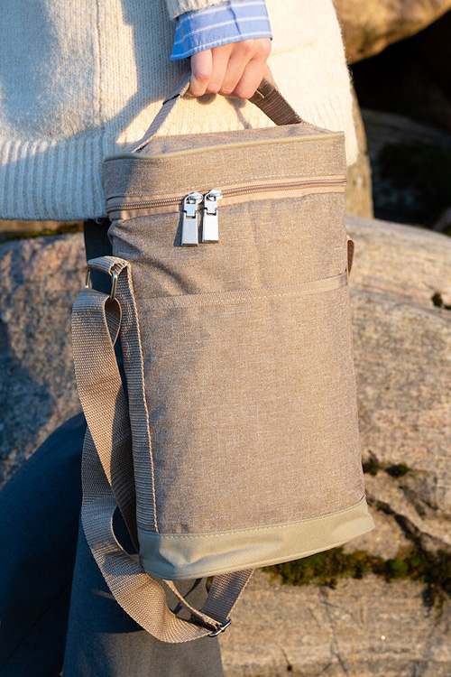 En smart lite högre kylväska. Passar tex till två vinflaskor eller 1,5 liter PET flaskor. Utrustad både med bärhandtag och justerbar axelrem.