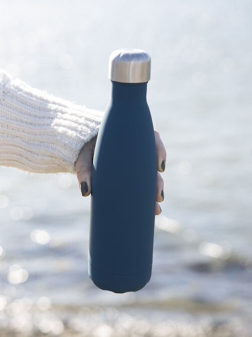 Sagaforms omåttligt populära stålflaska, nu med trendig matt gummiyta. Flaskan är dubbelväggig med kopparhölje så den håller dryck iskall i 24 timmar och varm i 12 timmar. Satsa på en vattenflaska av hållbar kvalité för både dig och miljön! Flaskan rymmer 50 cl. Nu även i blått.