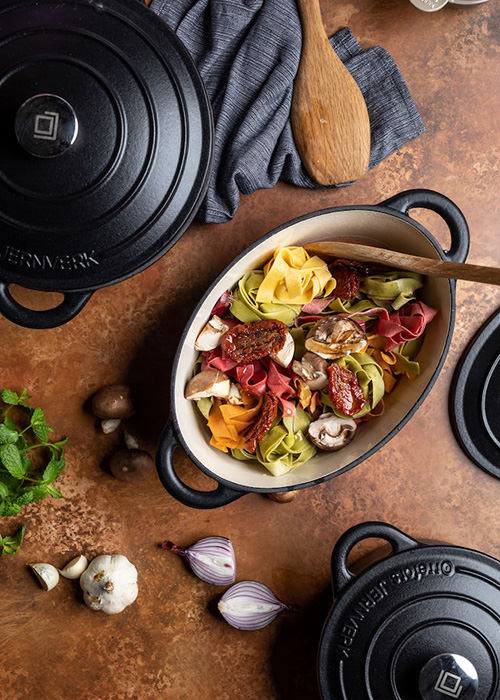 En rejäl emaljerad gjutjärnsgryta som rymmer allt du behöver för en riktig festmåltid.