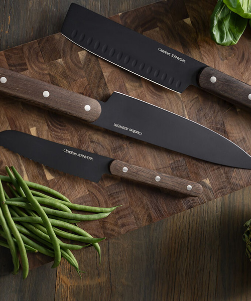 Stiligare än så här blir det inte! Dessa knivar har en unik design med mörka knivblad och trähandtag. Setet innehåller en tomatkniv, en japansk kockkniv och en kockkniv. Detta är knivar, som med rätt skötsel, håller i många år framöver! Material: Blad av stål, handtag av wengeträ. Storlek: Bladlängd - tomatkniv 12cm, japansk kniv 18cm och kockkniv 20cm