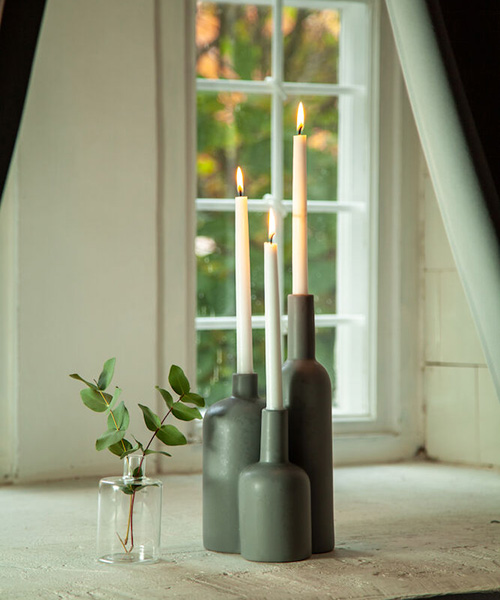 Denna charmiga ljusstake i porslin är formad som tre flaskor som sitter ihop. Den ger ett fint ljussken då ljusen hamnar i olika höjd. Passar fint i många olika miljöer.