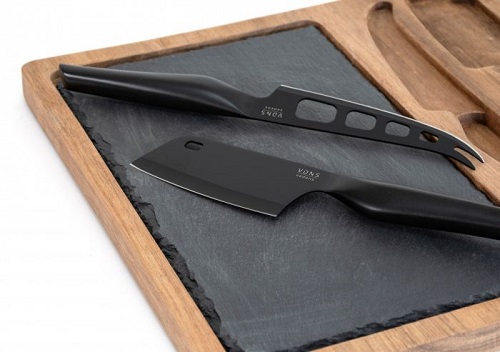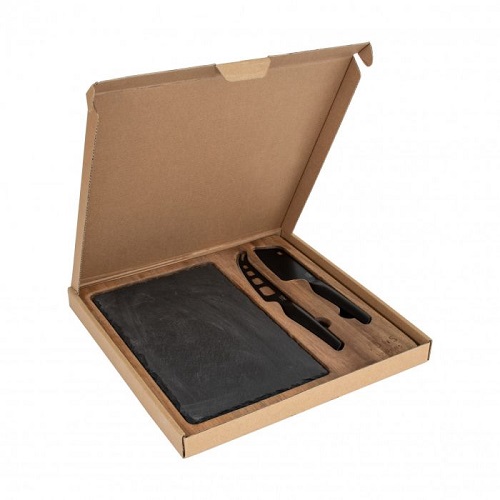 En riktigt rejäl ostbricka i fyra delar. Brädan som är tillverkad i FSC-certifierad Acacia rymmer dels en vacker skifferplatta för ostar samt två matchande svarta och väl tilltagna ostverktyg. Skifferplattan går enkelt att lyfta ur vid rengöring. Och brädan går naturligtvis också att användas upp och ner om skifferplattan inte skulle räcka till vid en rejäl ostfrossa.