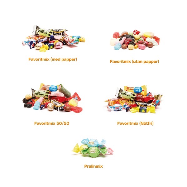 Favoritmix (med nötter) - En inslagen blandning av de mest populära godisbitarna från kända varumärken. Innehåller bla Kexchoklad, Marabou mjölkchoklad, Daim, Dumle, Plopp, Fox kola, Twix, Mars, Snickers, Bounty, Geisha, Nougatägg, Patroner (sur och salt) mm.