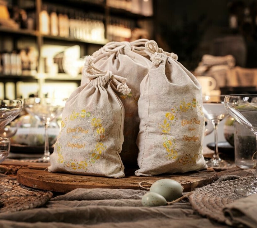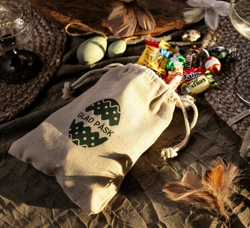 Fin linnesäck med sin karaktäristiska robusthet är en hållbar produkt att använda flera gånger. Tillverkad av material som är GOTS- och GRS certifierade. De finns i tre storlekar och fylls med inslaget kvalitetsgodis. Ni kan trycka er logotyp/hälsning direkt på säcken eller köp till ett fint påskkort med logotyp och hälsning.
