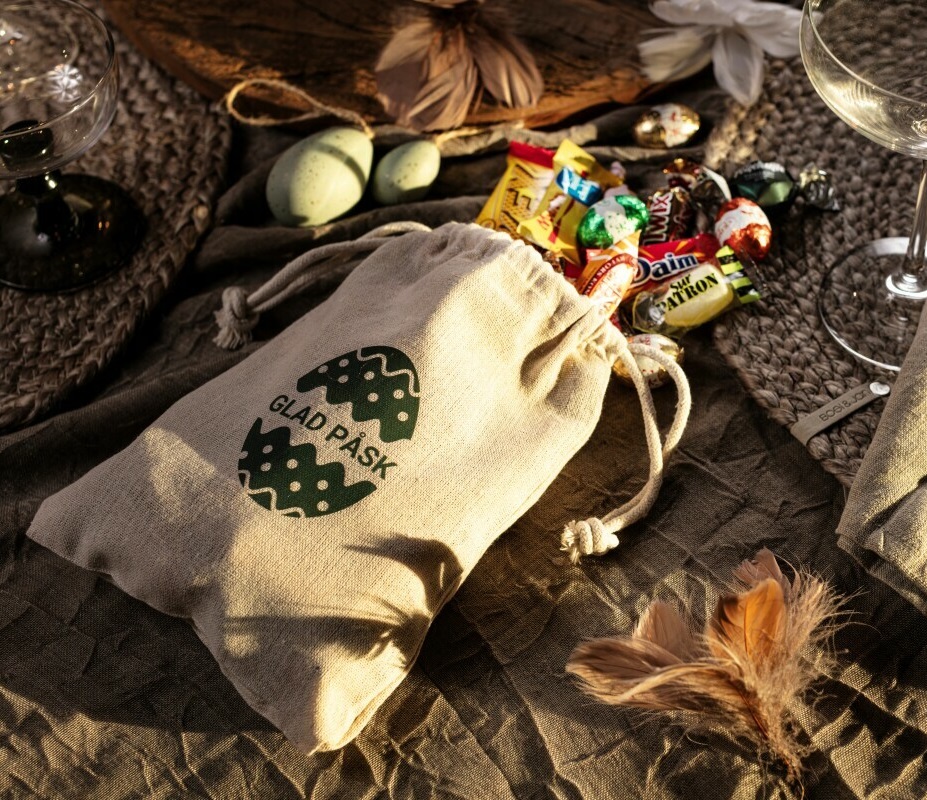 Fin linnesäck med sin karaktäristiska robusthet är en hållbar produkt att använda flera gånger. Tillverkad av material som är GOTS- och GRS certifierade. De finns i tre storlekar och fylls med inslaget kvalitetsgodis. Ni kan trycka er logotyp/hälsning direkt på säcken eller köp till ett fint påskkort med logotyp och hälsning.