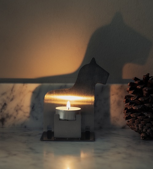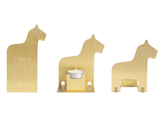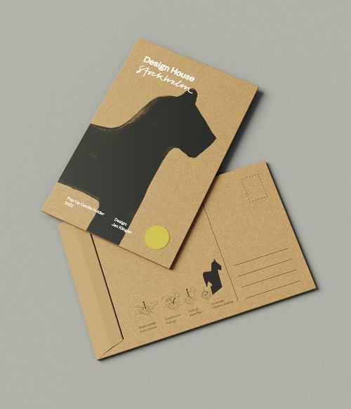 Ljuslykta Pop-Up Dalahäst formgiven av Jan Klinger för Design House Stockholm. Ett värmeljus placeras på lyktans baksida, ljuset reflekteras vackert i metallen och sprider ett behagligt sken. Den vackra ljushållaren kommer i ett platt kuvert som lätt skickas på posten. Skriv din hälsning på paketet och skicka som ett traditionellt julkort med en överraskning inuti. Ljusstaken viks enkelt upp av mottagaren.