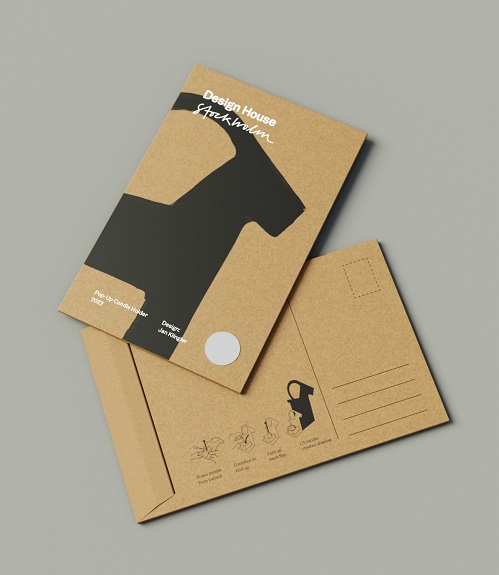 Ljuslykta Pop-Up Julbock formgiven av Jan Klinger för Design House Stockholm. Ett värmeljus placeras på lyktans baksida, ljuset reflekteras vackert i metallen och sprider ett behagligt sken. Den vackra ljushållaren kommer i ett platt kuvert som lätt skickas på posten. Skriv din hälsning på paketet och skicka som ett traditionellt julkort med en överraskning inuti. Ljusstaken viks enkelt upp av mottagaren.