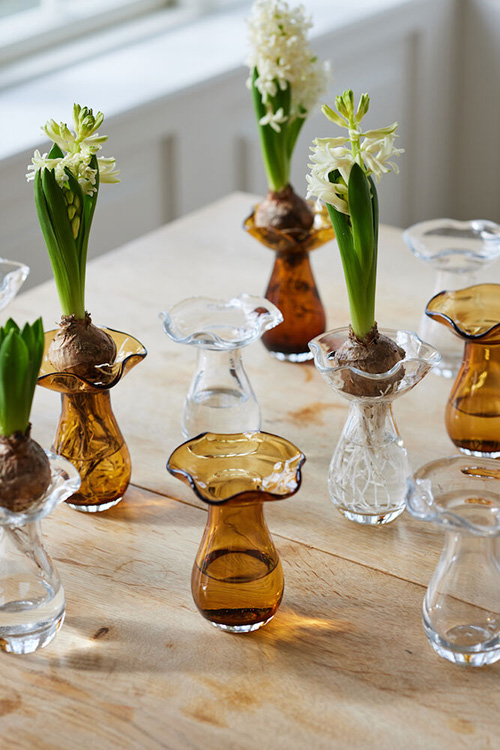 Inspirerad av naturens egna kraftkällor blir Viva vas mini ett vackert original. Vasens topp för tankarna till en nyutslagen blomma medan basens form är hämtad från en regndroppe. Hyacintlökarna ligger perfekt i den rundade toppen, men också småblommor eller sticklingar står stadigt. Vi ger gärna ledsna buketter ett nytt liv och knipsar av topparna för att pryda Viva vas mini. Vasen är vacker när den stoltserar på egen hand, men också fin att blanda med den övriga kollektionen av Viva vaser. Finns i två färger – klar och bärnsten.