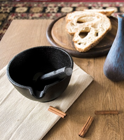 Satakes gjutjärnsserie Nabe innehåller grytor i olika storlekar, en riktigt läcker wok samt denna vackra gjutjärnsmortel med praktisk pip och greppvänlig stöt. Tyngden i morteln är perfekt då den står riktigt stadigt på köksbänken och stötens tyngd gör arbetet enkelt. Krossar lätt alla sorters kryddor i morteln.
